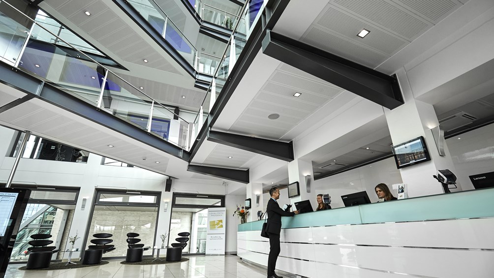 Det mærkes allerede i foyeren, hvor det 7-etagers glastårn lader dagslyset danse over højglansflader og Lin Utzons blå glaskunst, mens havnens refleksioner kaster et levende spil af lys og skygger.